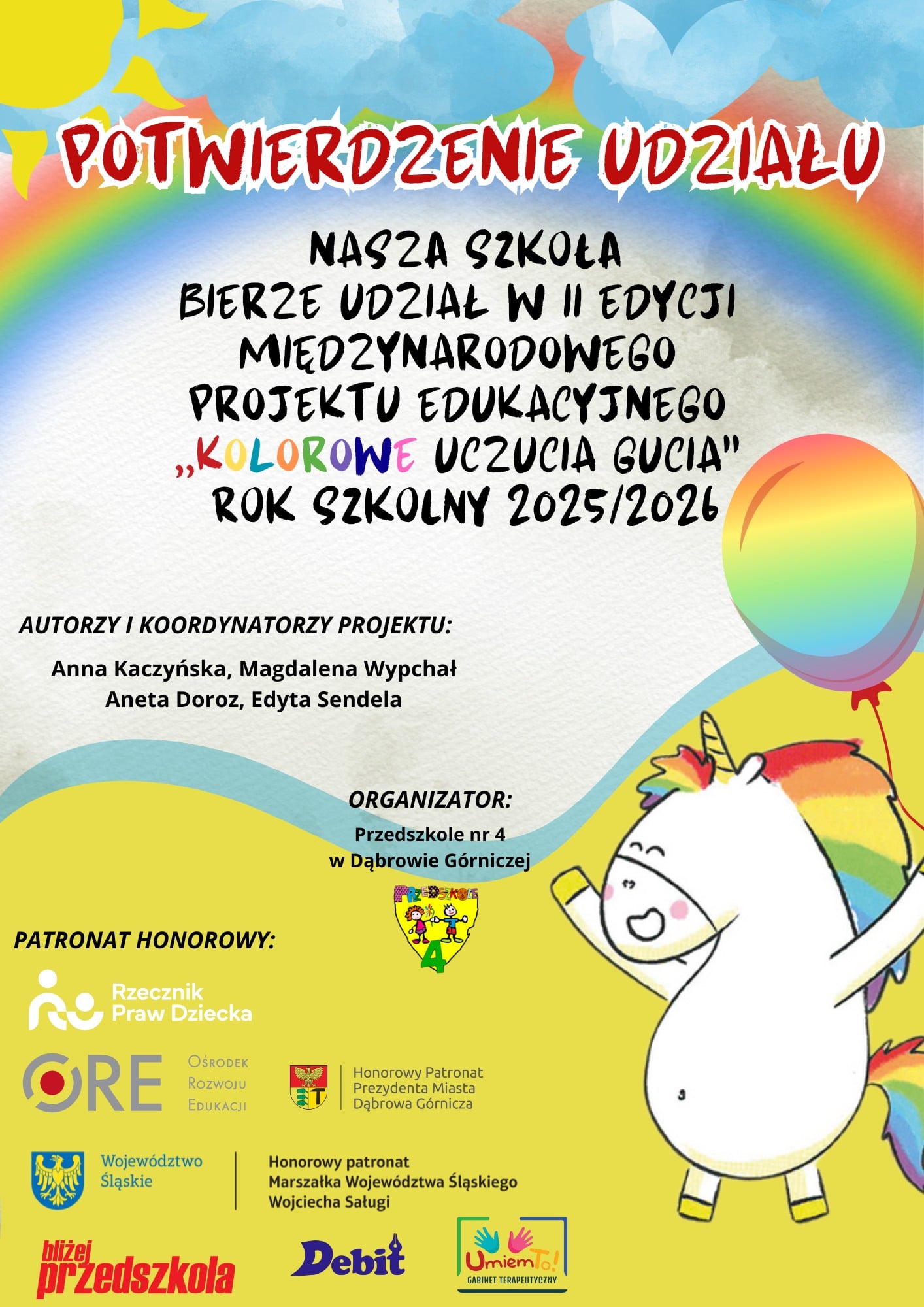 Z radością informujemy, że przystąpiliśmy do innowacyjnego projektu „Kolorowe Uczucia Gucia”, którego celem jest wspieranie dzieci w rozpoznawaniu, nazywaniu i wyrażaniu emocji. Dzięki zabawie, aktywnym metodom pracy oraz obecności maskotki – jednorożca Gucia – uczniowie będą uczyć się lepiej rozumieć siebie