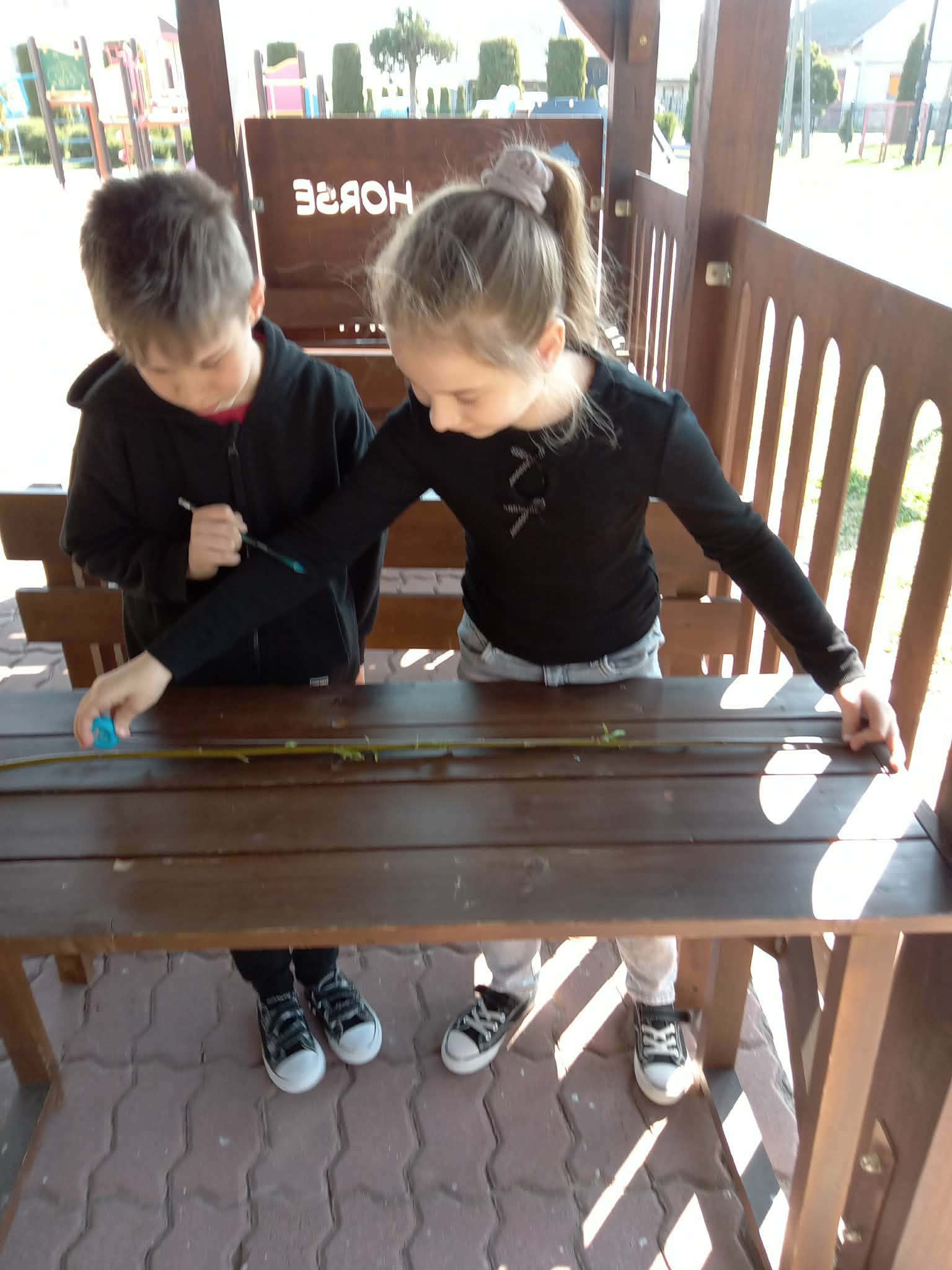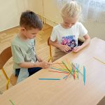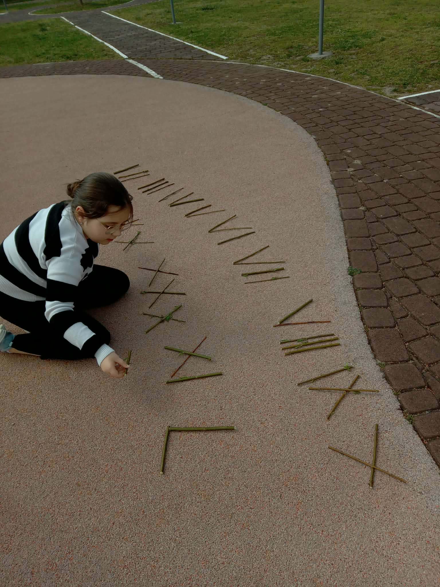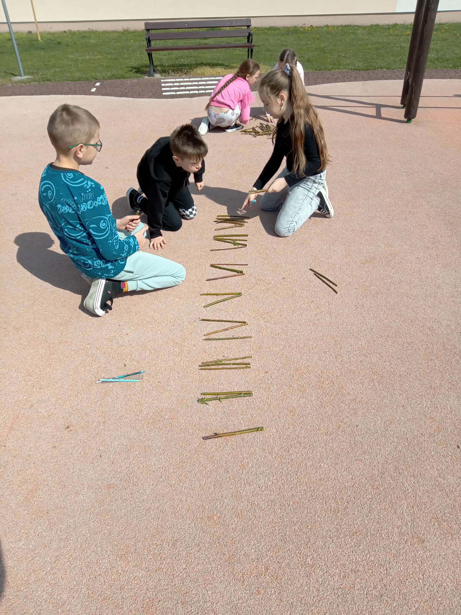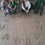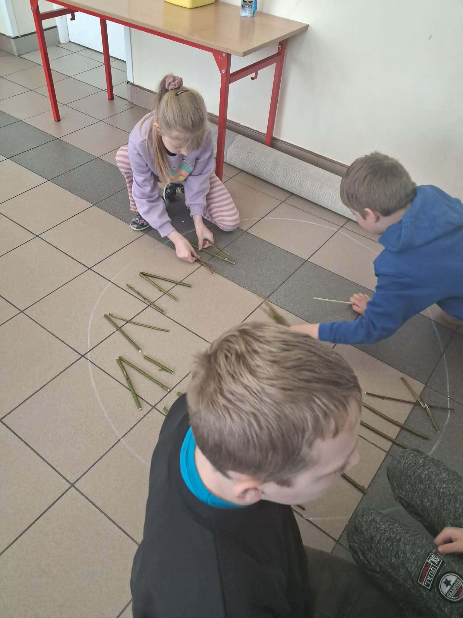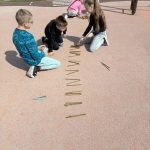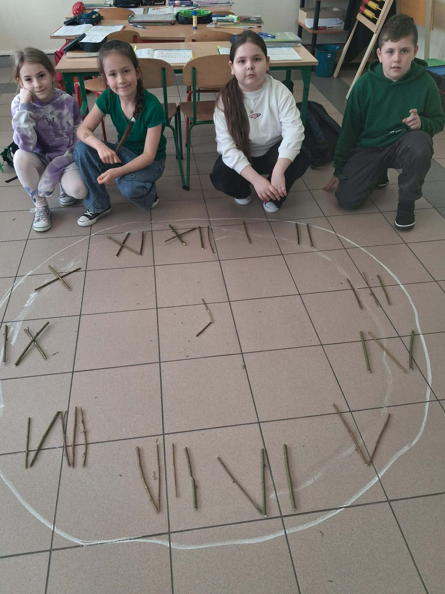 Korzystając z gałęzi dzieci samodzielnie odmierzały patyki, a następnie przycinały je do odpowiedniej długości. Z przygotowanych elementów układały cyfry rzymskie utrwalając w praktyce zdobytą wiedzę matematyczną. To zadanie było nie tylko świetną okazją do nauki, ale także do rozwijania precyzji, kreatywności i współpracy.