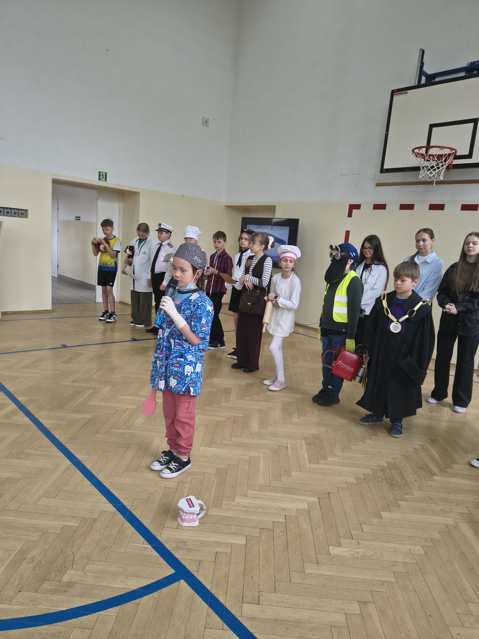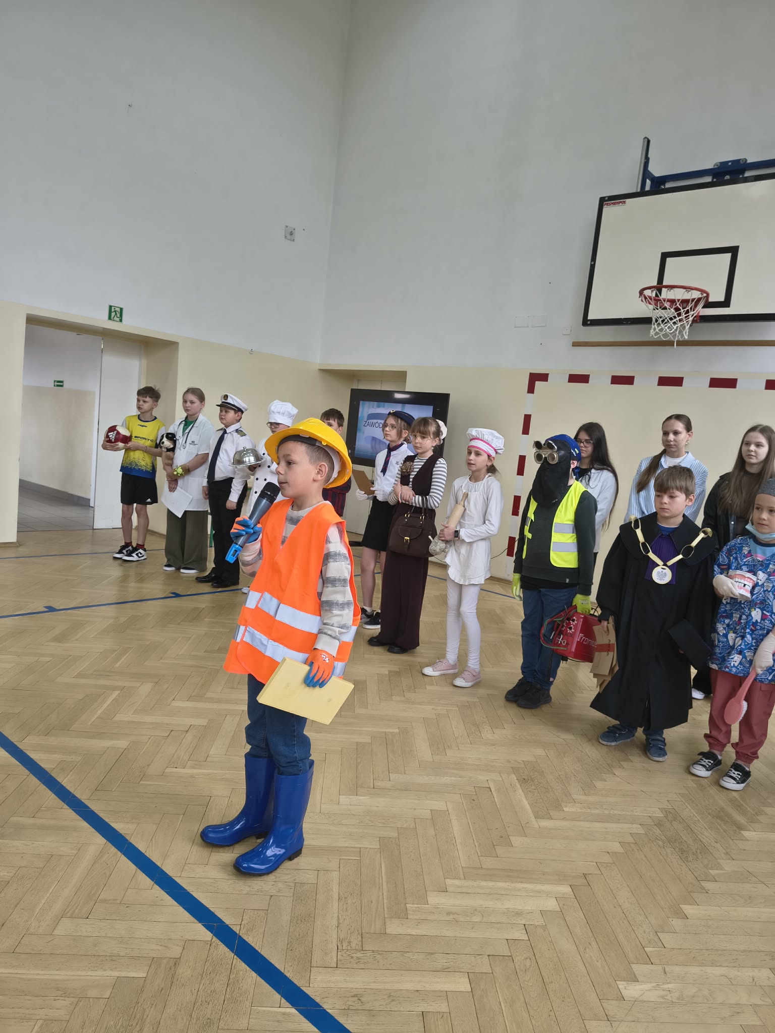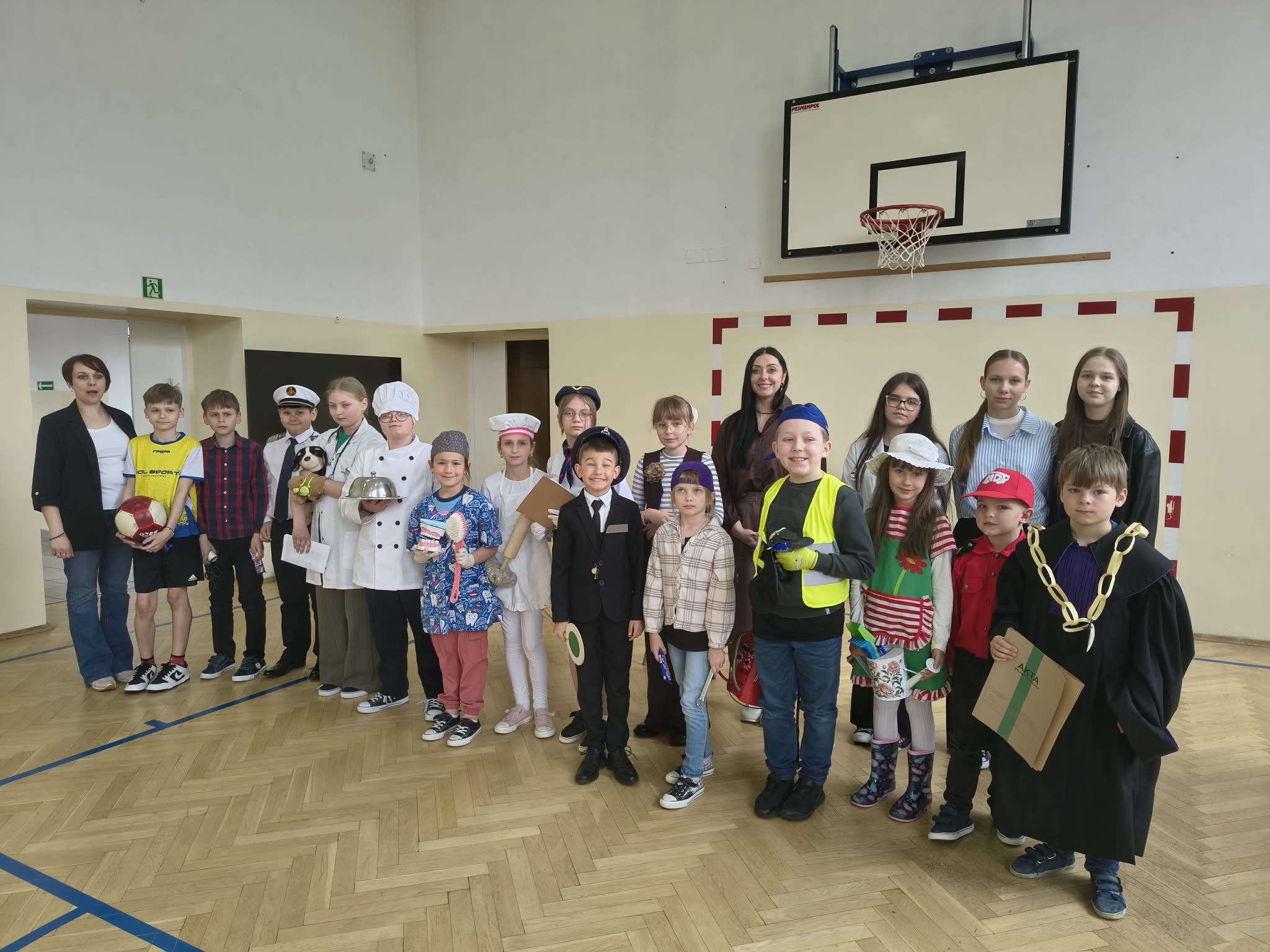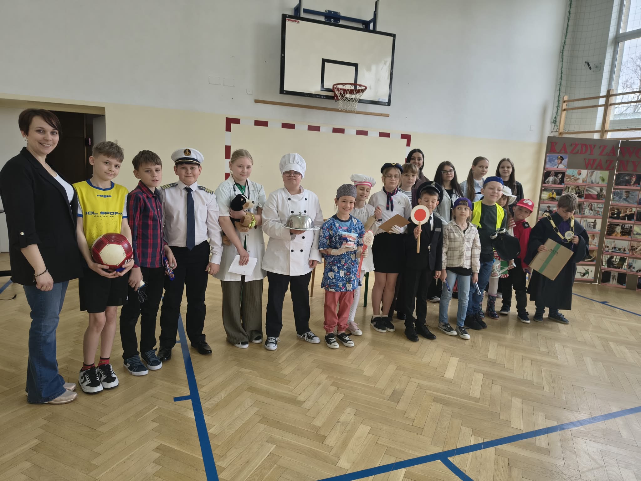 Szkolny Pokaz Zawodów, który odbył się 14 kwietnia, miał wyjątkowo kreatywny charakter i został zorganizowany w ramach realizowanego w szkole projektu o zawodach. Chętni uczniowie klas 1–8 oraz dzieci z oddziału przedszkolnego wcielili się w przedstawicieli różnych profesji – przebierając się w odpowiednie stroje i przygotowując krótkie wypowiedzi na temat wybranego zawodu. Opowiedzieli na czym polega dana praca i jakie umiejętności są w niej potrzebne. Niektórzy nawet zaprezentowali zawód w języku angielskim.