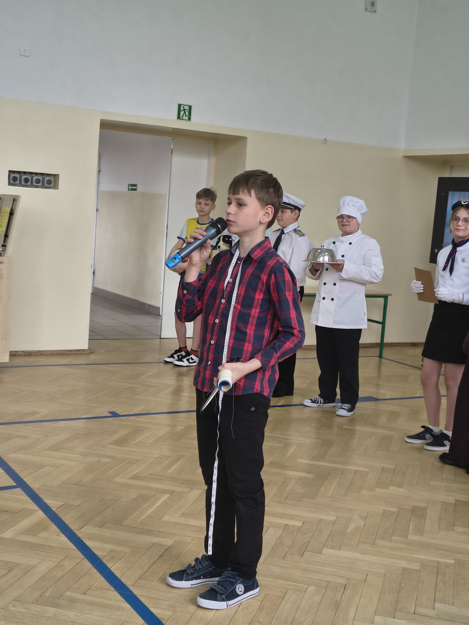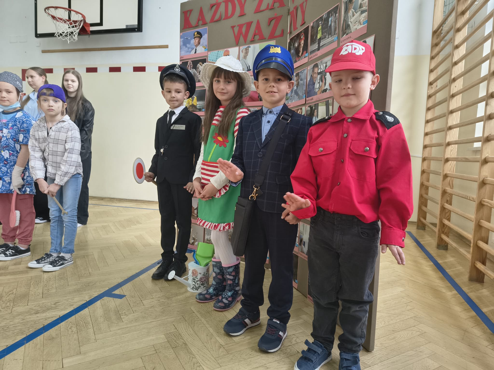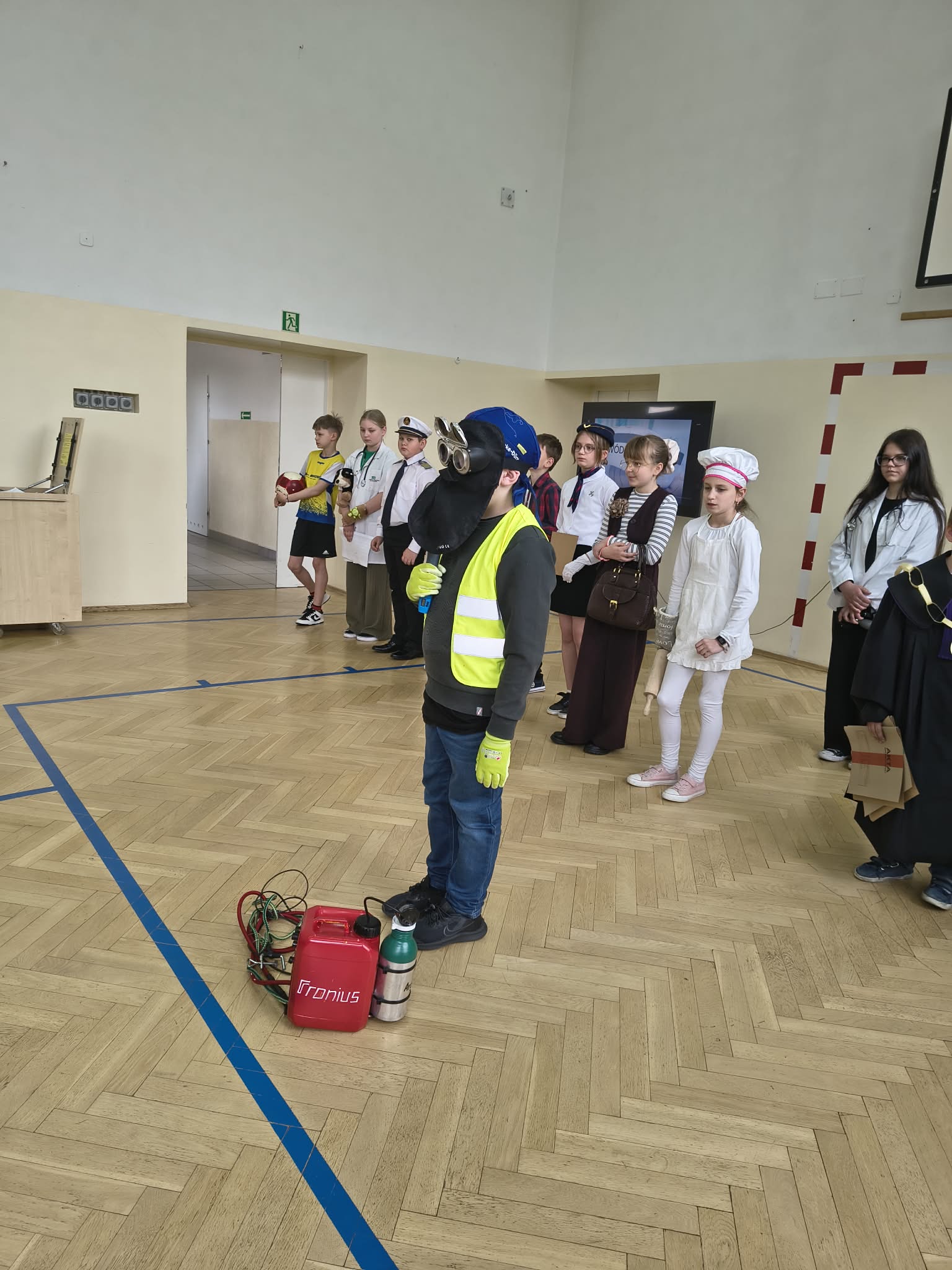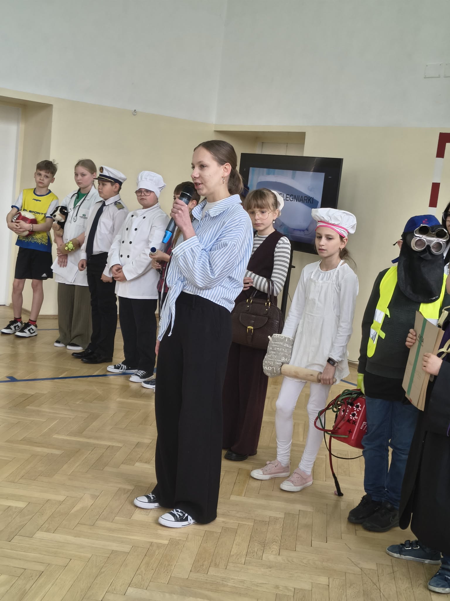 Szkolny Pokaz Zawodów, który odbył się 14 kwietnia, miał wyjątkowo kreatywny charakter i został zorganizowany w ramach realizowanego w szkole projektu o zawodach. Chętni uczniowie klas 1–8 oraz dzieci z oddziału przedszkolnego wcielili się w przedstawicieli różnych profesji – przebierając się w odpowiednie stroje i przygotowując krótkie wypowiedzi na temat wybranego zawodu. Opowiedzieli na czym polega dana praca i jakie umiejętności są w niej potrzebne. Niektórzy nawet zaprezentowali zawód w języku angielskim.