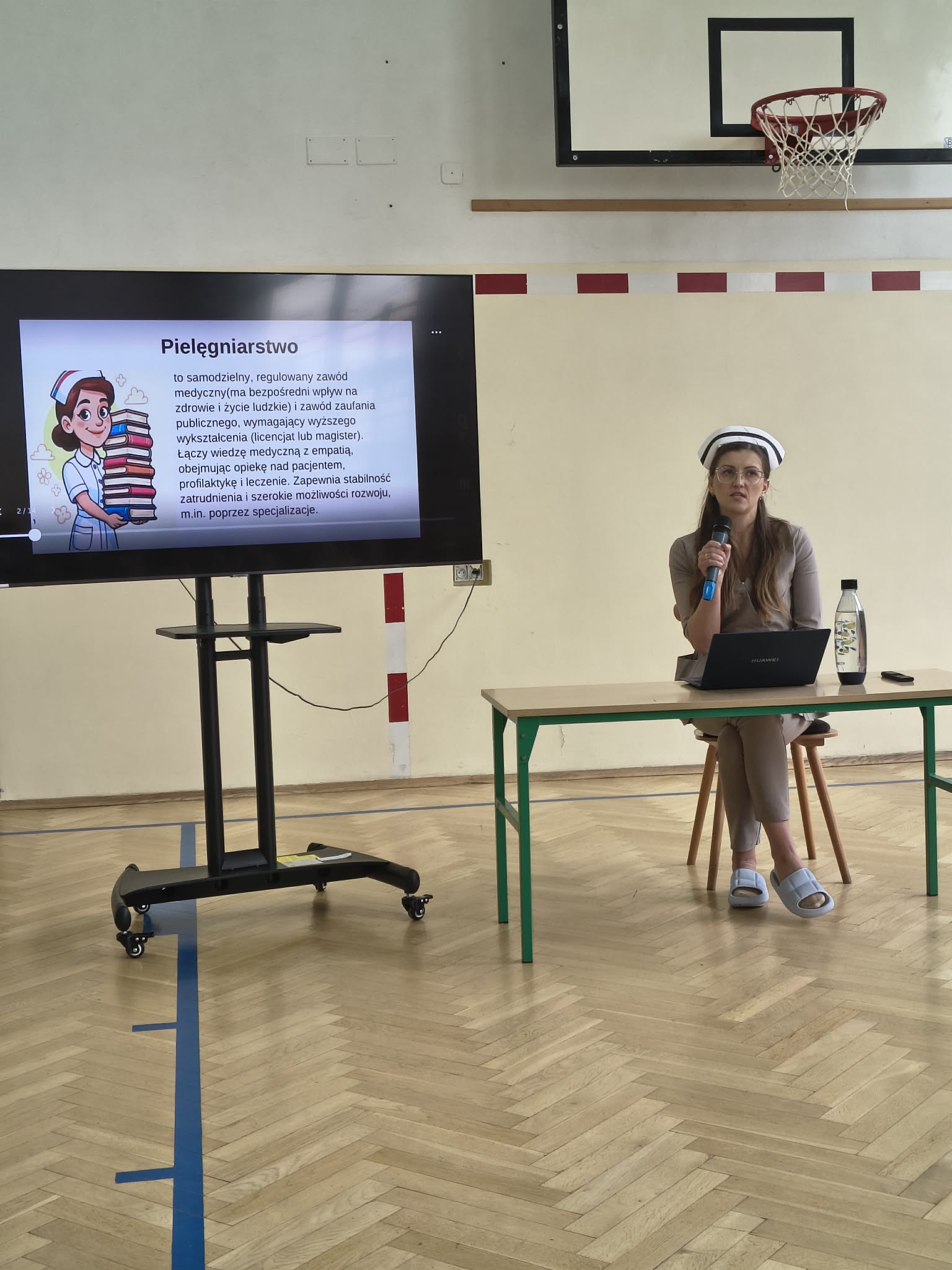 Dodatkowym elementem wydarzenia była prezentacja zawodu pielęgniarki, którą przedstawiła higienistka szkolna. Przybliżyła ona uczniom specyfikę swojej pracy oraz znaczenie opieki medycznej. Wydarzenie było nie tylko interesujące, ale także inspirujące dla wszystkich uczestników.